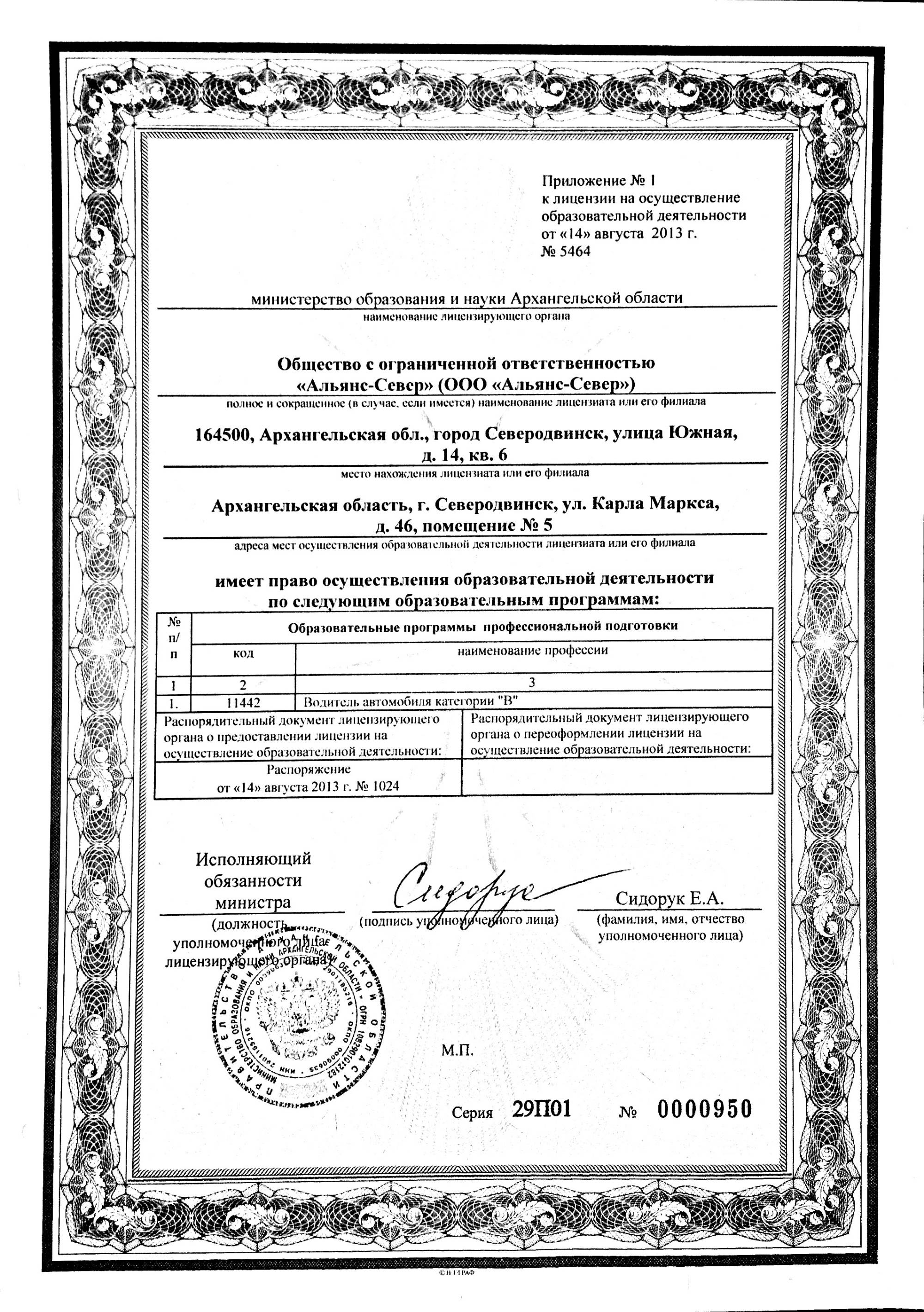 категорий «А», «В». Лицензия серия 29Л01 №0000377, рег. №5464 от 14.08.2013 выдана министерством образования
